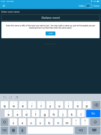 Click on arrow on top left and enter a name for a room (you can choose any name, the more it will be specific the less it might be intercepted by undesired people) and then click on Join: